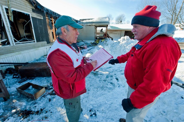 Recently, when I received a Red Cross dispatch call at 5 A.M., I realized that fire fighters had probably been on the scene since 1 or 2 A.M. and that those displaced by the fire had been out in the -10° weather since then. The drive to the fire took almost an hour. At the fire scene, I spoke with a chief and found the individual displaced by the fire. I invited him into my car for a short interview and then handed him an envelope containing a loaded Casualty Assistance (debit) Card. I explained,
