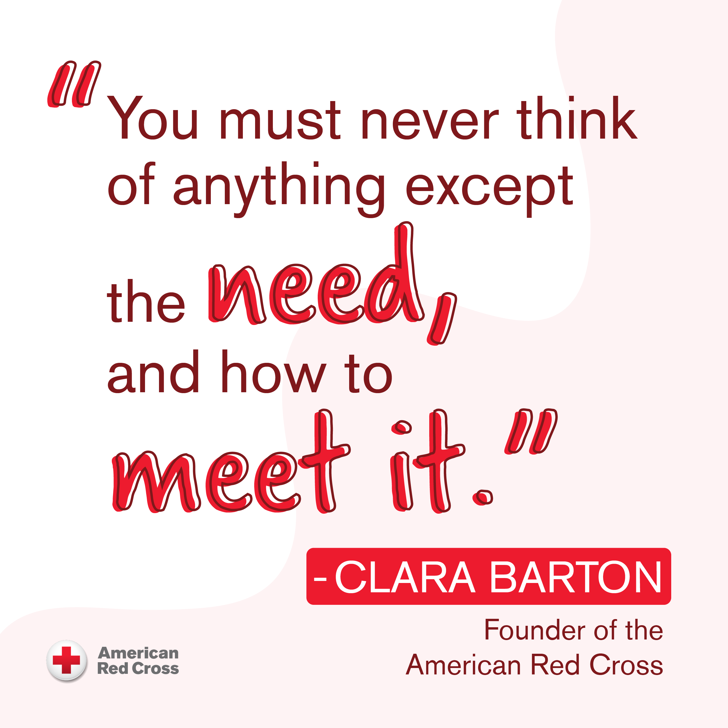 Today’s Red Cross volunteers, blood and platelet donors and supporters are advancing the lifesaving legacy of Clara Barton — one of the most honored women in U.S. history — who founded the American Red Cross more than 140 years ago. Her vision to prevent and alleviate human suffering has never wavered: Generation after generation, people have come together to adapt this timeless mission for their communities’ most urgent needs.