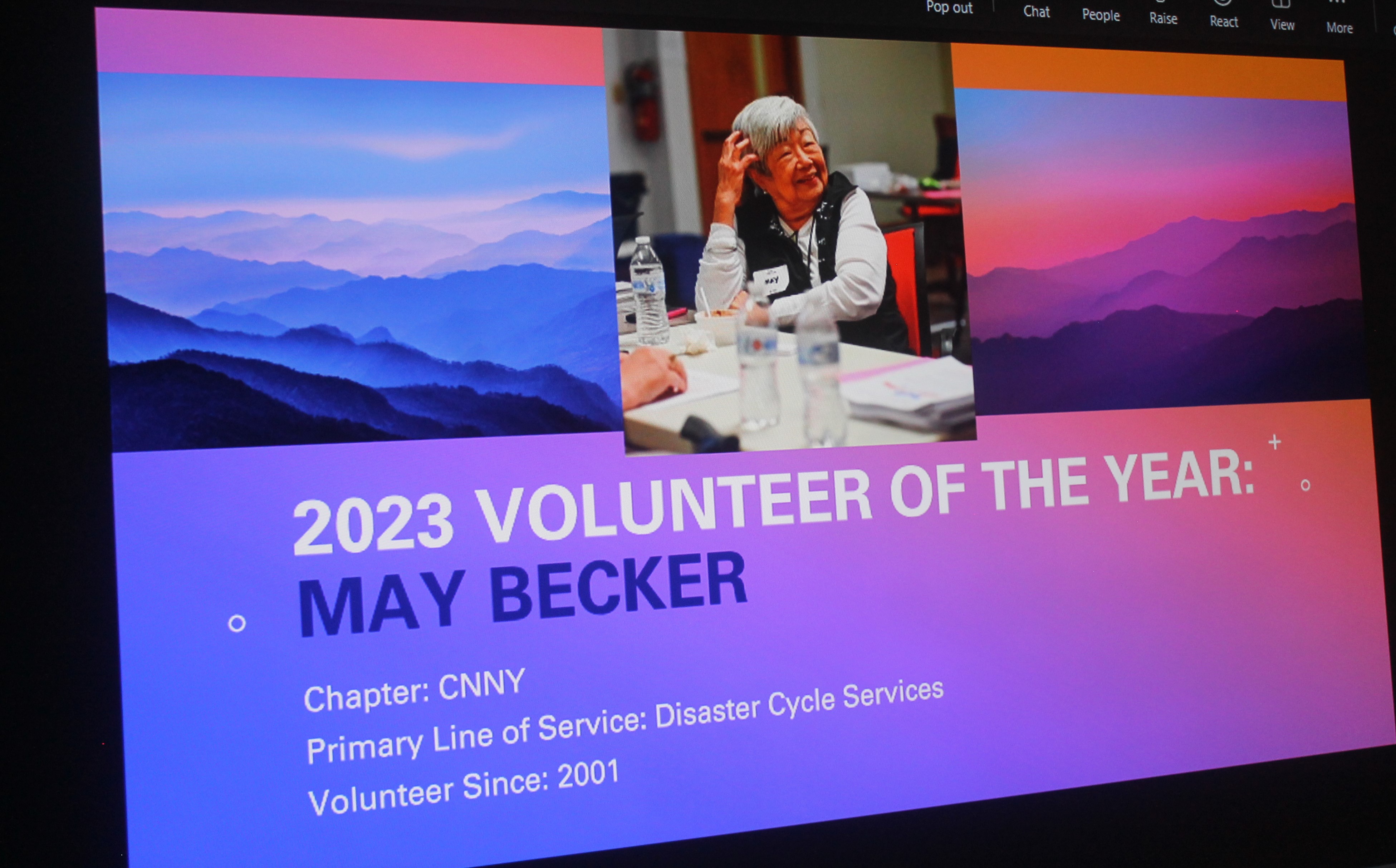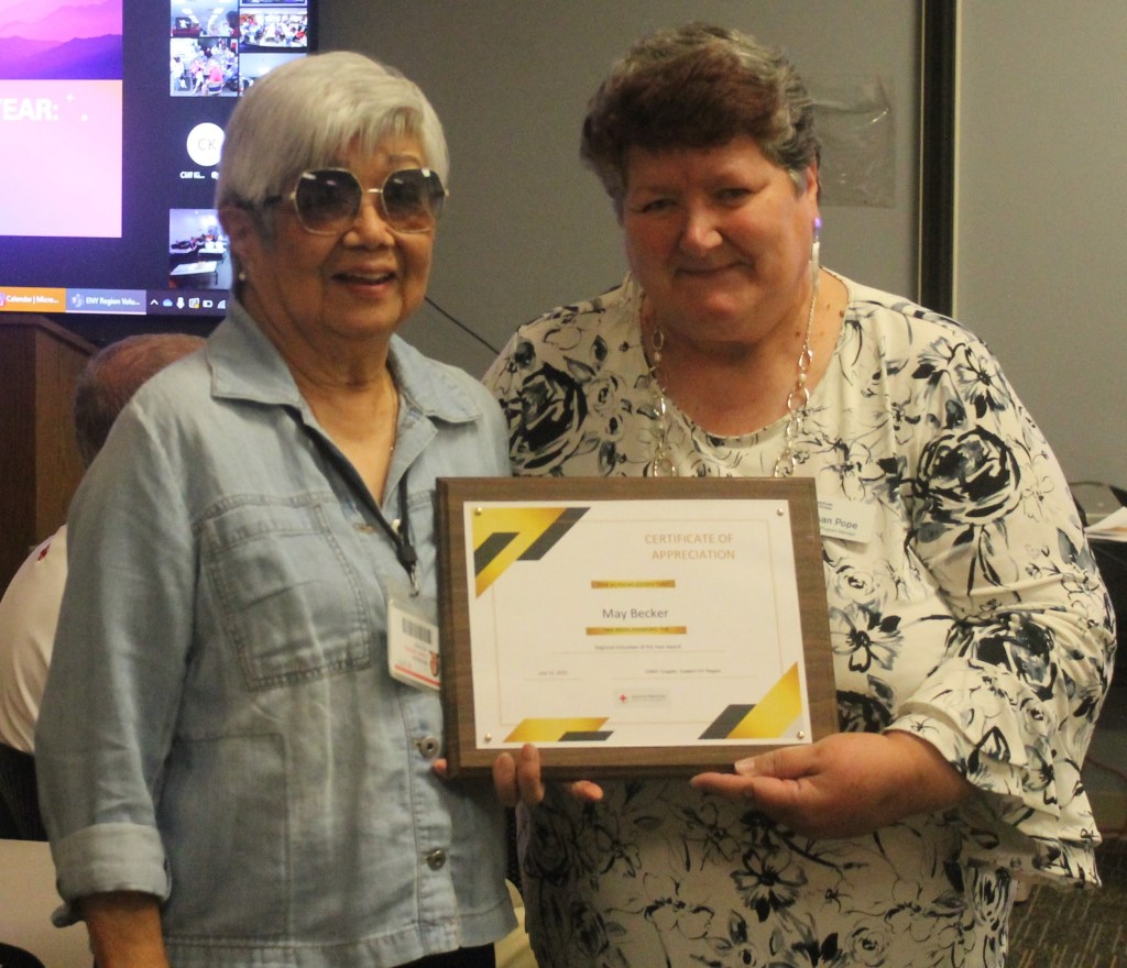 May received the award at our recent Regional Volunteer Awards Ceremony with volunteers and staff attending at all of our offices across the region, as well as virtually. Disaster Program Manager Susan Pope presented the award with these remarks: