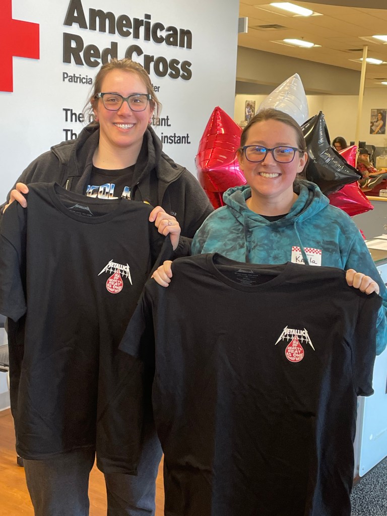 Balancing the attention to detail and flow of a full donor schedule is one thing, this team also managed to find room for the influx of walk-in donors helping to save lives and score the limited-edition Red Cross + Metallica t-shirt. Pictured: Amanda and Kayla had tickets for the concert and scored their t-shirts at the blood drive.