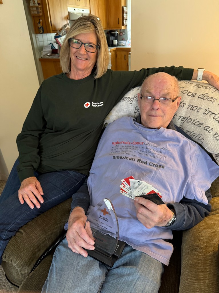 “After years of donating whole blood, he then donated Plasma, and then onto platelets. He received an Apheresis Achievement Award in 2008 from the Red Cross for donating 18 or more times that year.